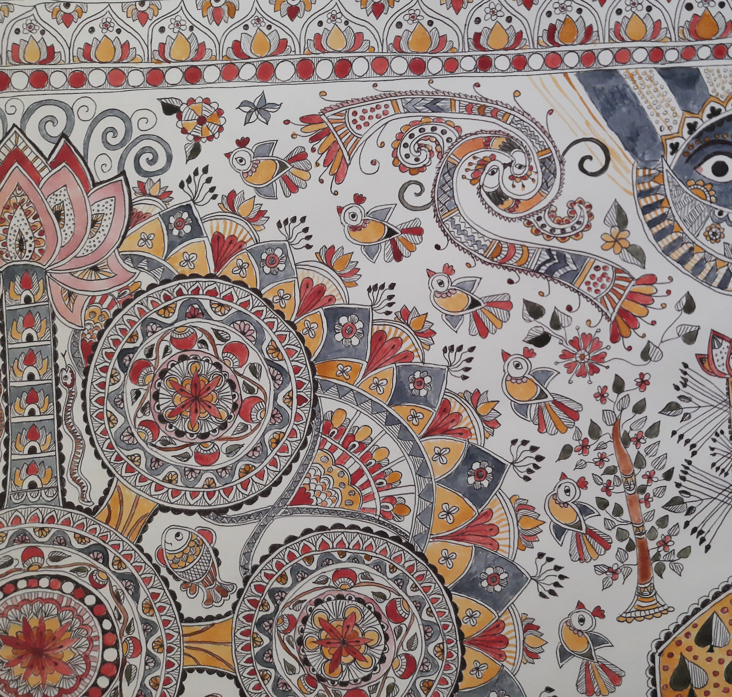 Kohbar is a complex painting of Madhubani style, traditionally drawn on the wall of the room where the young couple would spend their first few days after marriage. It is filled with various symbols meant to promote prosperity and fertility and educate the young couple. In my Kohbar I used some of the motives and designs learned from Priti Karn, and also took inspiration from the Kohbar of her grandmother. Padma Sri awardee Godavari Dutta, along with adding my own designs.
