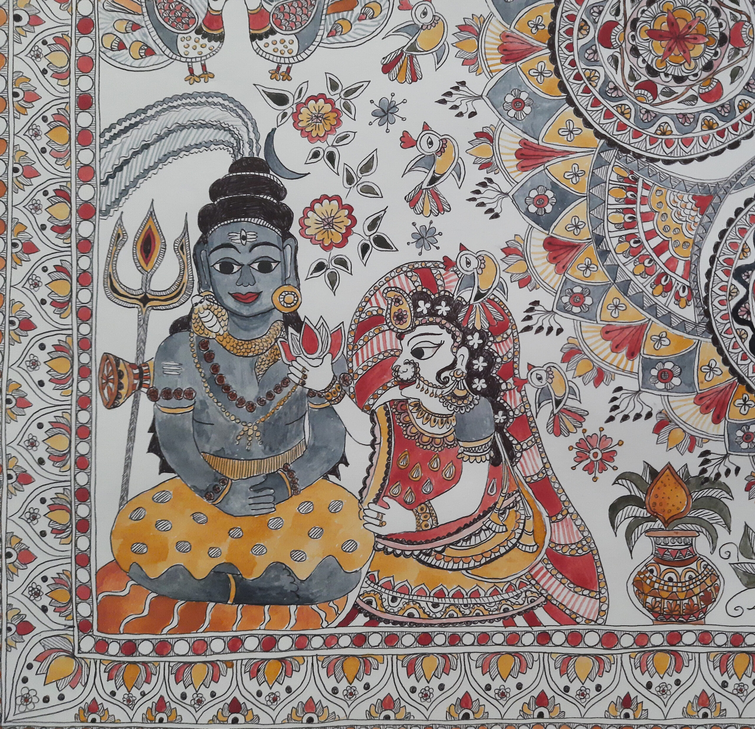 Lord Shiva and his consort Parvati occupy a prominent part in the Kohbar painting. They are considered the most happy and well-matched couple in the material universe, hence all newly married couples would pray to them for the success of their own marriage. Lord Shiva is often depicted living as an ascetic, wearing a tiger skin and matted hair. He bears Ganga on his head upon her descent on earth, along with the moon. Snake king Vasuki, his ardent devotee, is always around his neck. Lord Shiva carries his characteristic trident and a small drum (“damaru”). His wife Parvati is always by his side and always happy in his company.