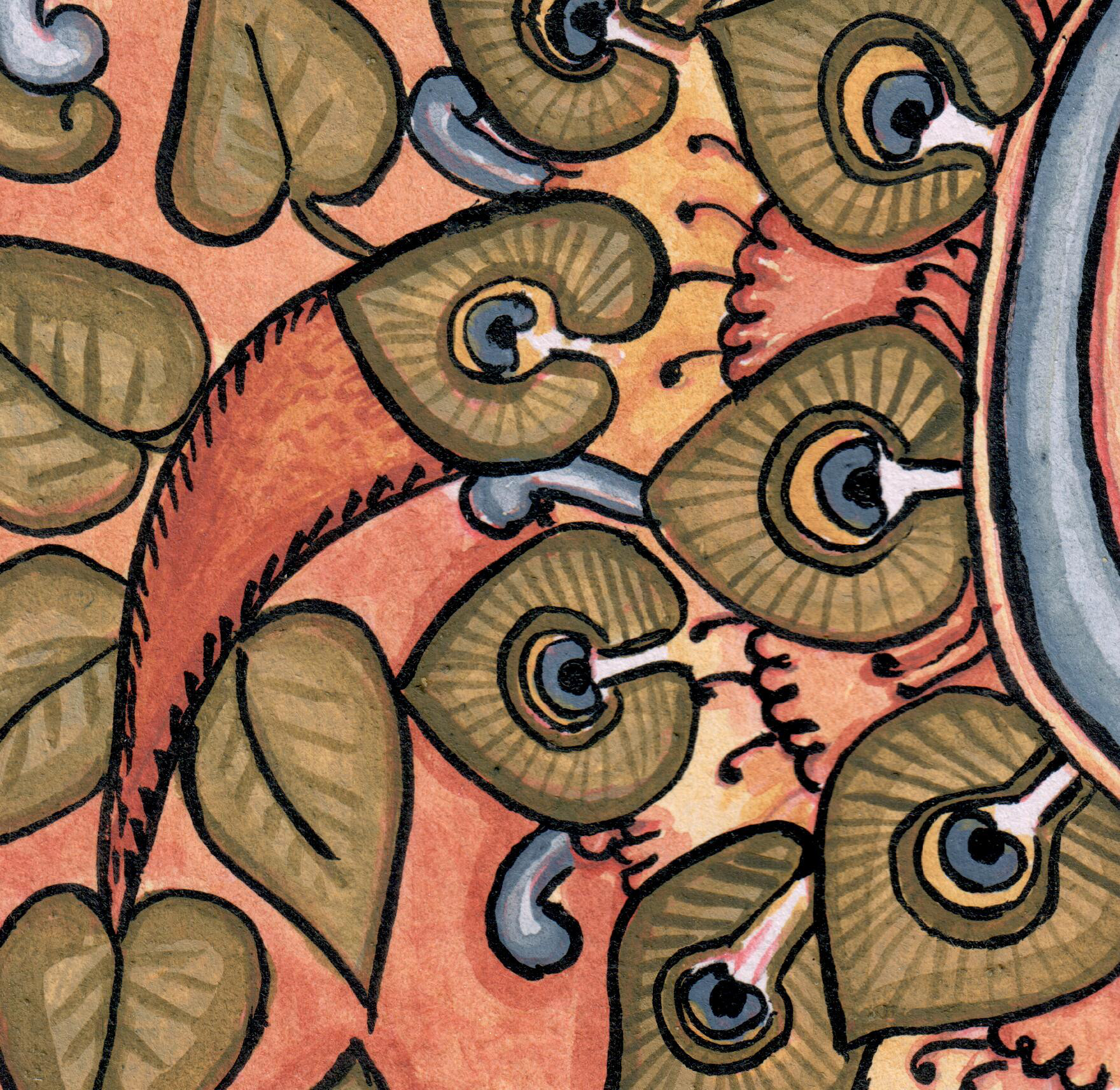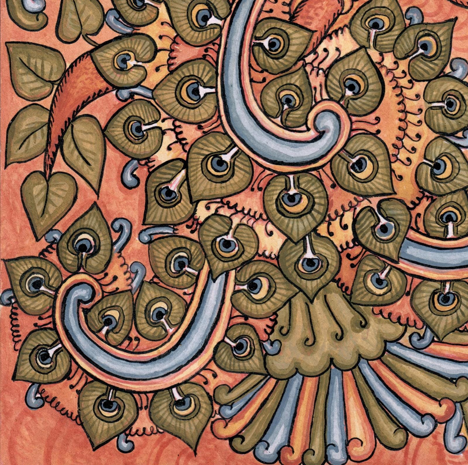 I keep learning the beautiful art style of Kerala murals, and here is a peacock painted this style. Peacocks are not only gracious and beautiful, but also favorite birds of Lord Krishna in His Vrindavana pastimes. In the iconography of India, Krishna always wears one or multiple peacock feathers, as do many Vishnu forms. During the hot season Deities in the temples are fanned with elaborate peacock feather fans.
